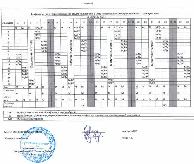График уборки секции Б сентябрь 2025 г.