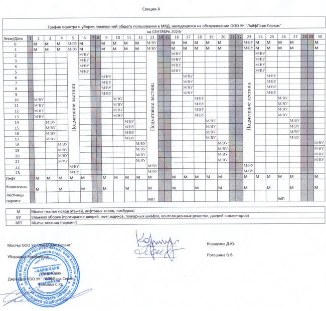График уборки секция А сентябрь 2024г